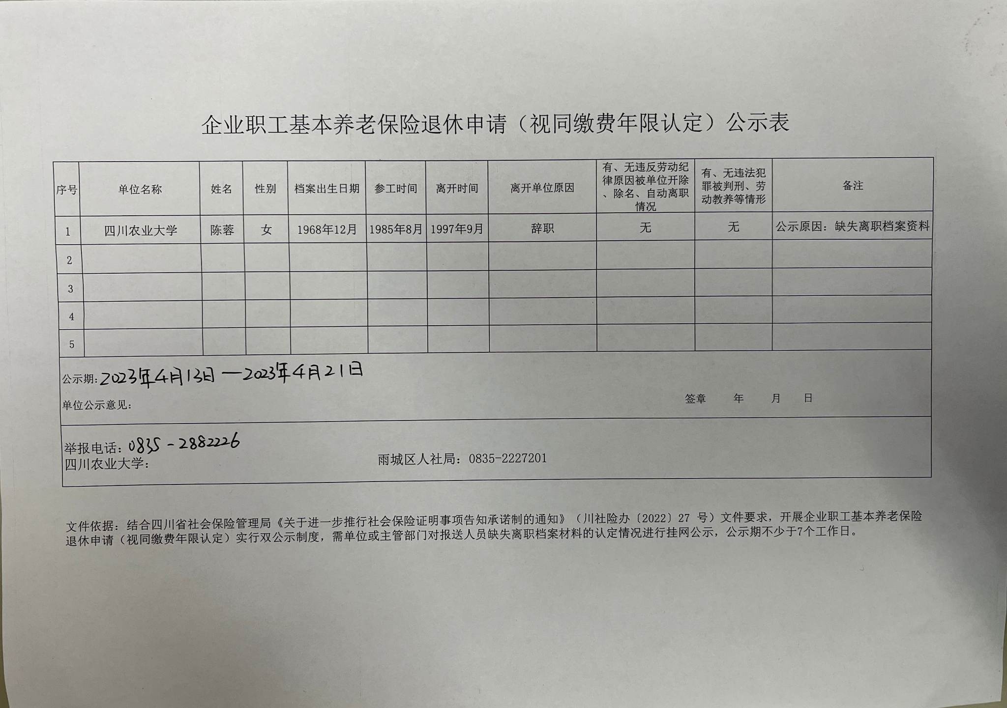 陈蓉养老保险退休申请(视同缴费年限认定)公示